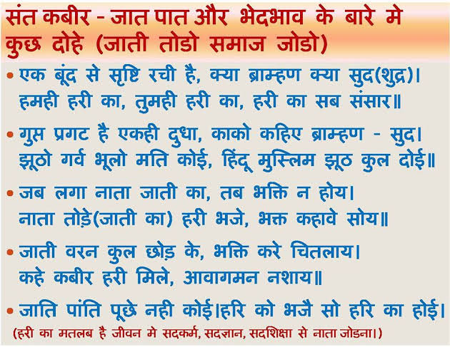 मजहब, मुल्क, कोम, नस्ल और जाति पाति के सब भेद अज्ञानता की उपज है। जो लोग अपने धर्म या जाति को बड़ा समझते है, अज्ञानता के अंधकार में फसे हुए है। जो दुसरो को जाति और धर्म के नाम पर छोटा समझते है, वे स्वय ज्ञान और प्रेम में छोटे है। वास्तव में जीव की जाति उसके कर्मो के अनुसार होती है। जाति उन लोगो की ही छोटी है, जो सच्चे शब्द या नाम की कमाई नहीं करते और द्वैत भाव तथा विषय विकारों में लिप्त है। अगर हम अपने चारो ओर नजर डाले तो हमे पता चलेगा कि पापी और गुनहगार हर धर्म में है। इसी तरह नेक इनसान भी सभी धर्मो में है। जिन जातियों को हम अज्ञानता वश छोटा समझते है, उनमें भी नेक रहनी, निर्मल आचरण और पवित्र विचारो वाले अनेक लोग है और जिन जातियों को हम अज्ञानता के कारण ऊंचा समझते है, उनमें भी पापियों, अत्याचारियों और बेईमानों की कोई कमी नहीं है।